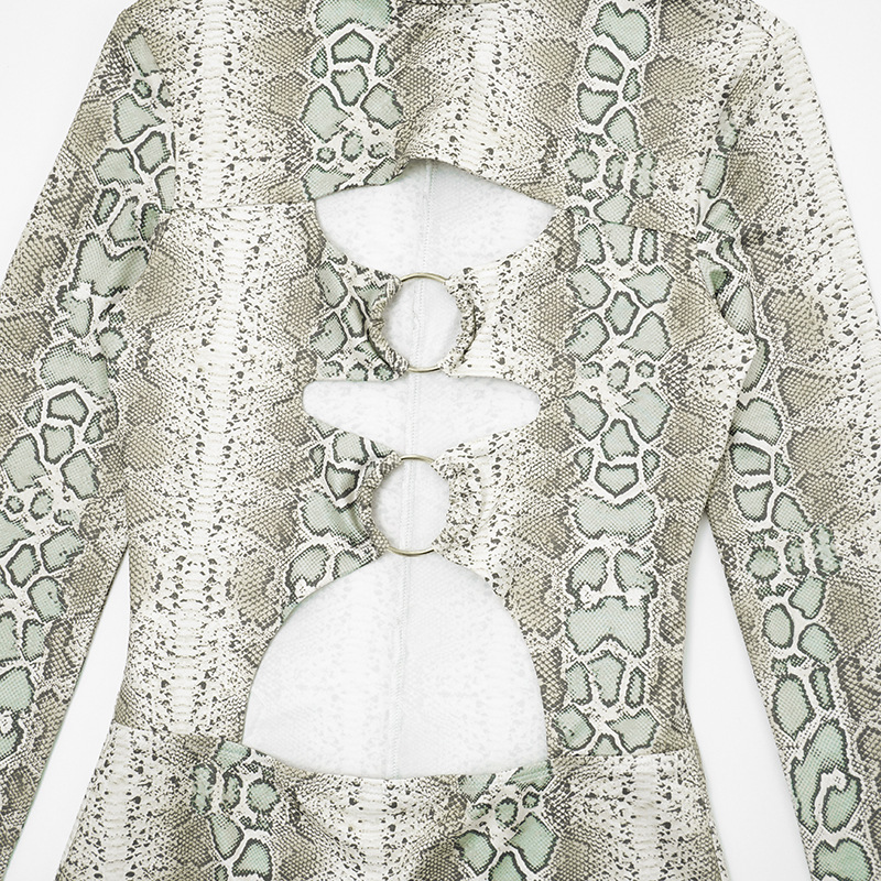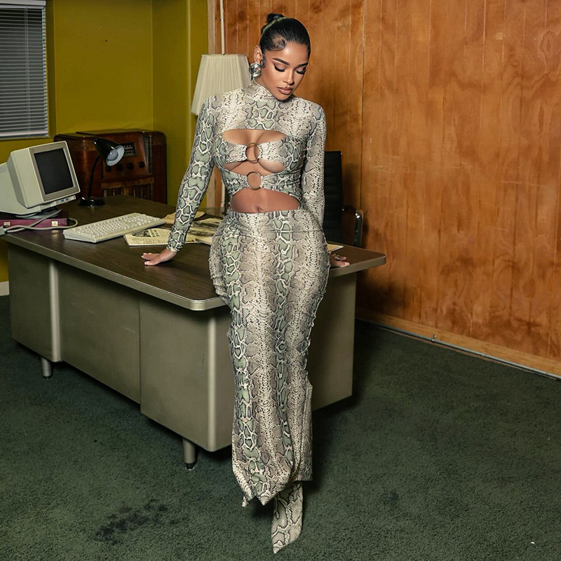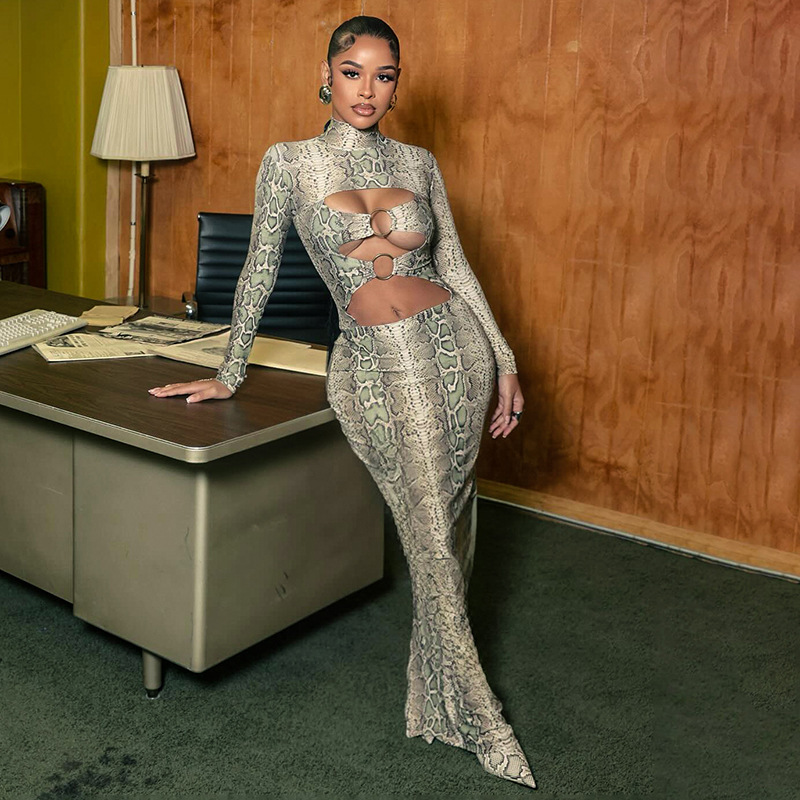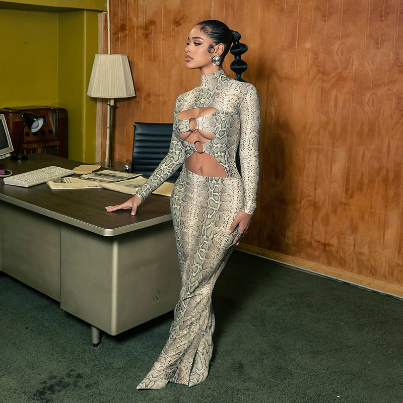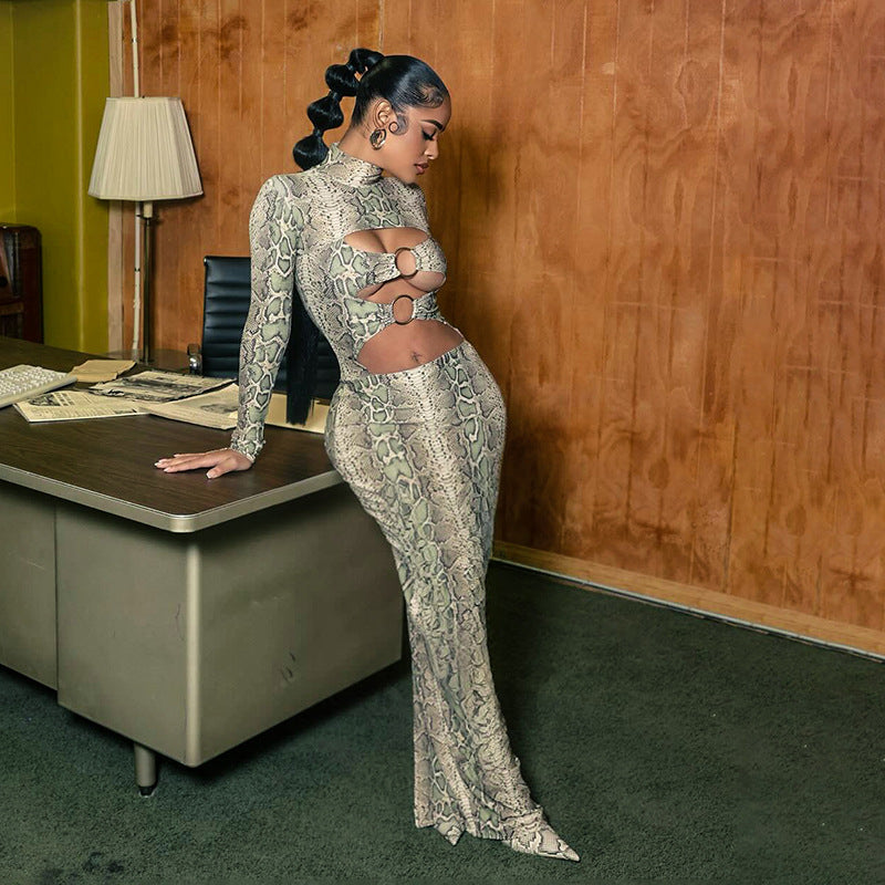 Printed Sexy Figure-hugging Long-sleeve Hollow-out Maxi Dress